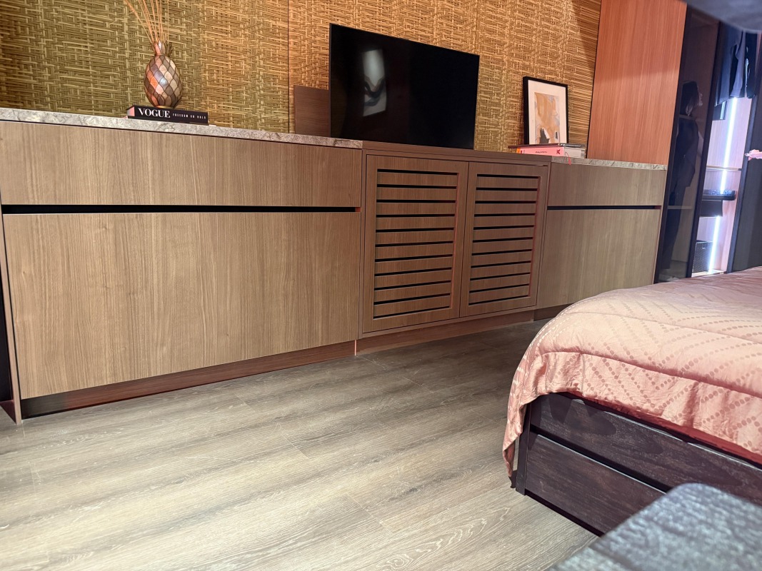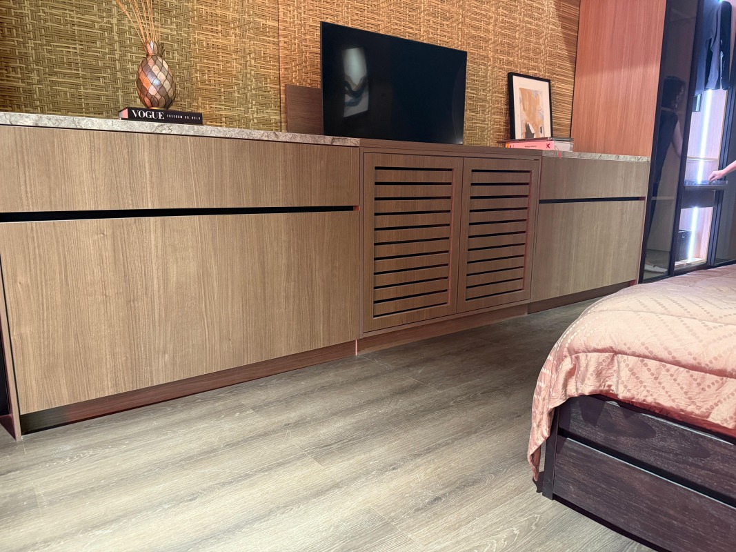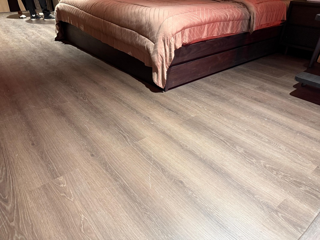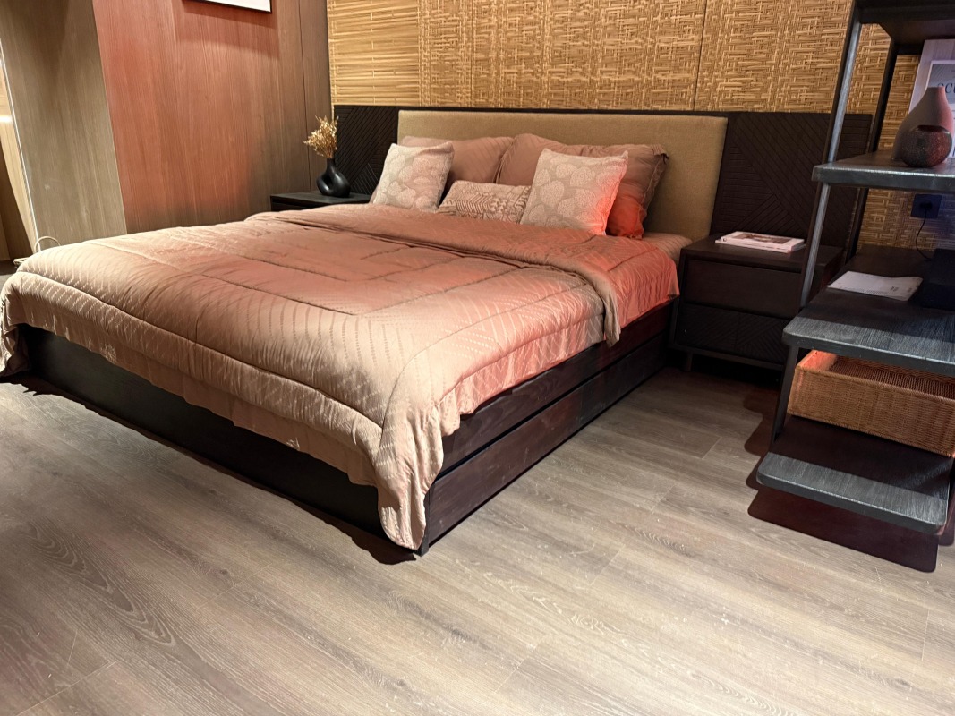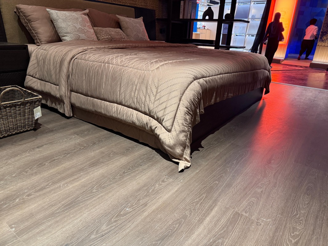 Salah satu elemen penting yang mendukung visual dan kenyamanan booth Viro x Hafele adalah penggunaan AICA SPC Floor tipe SPCK 33019 – Dark Sienna. Produk ini dipilih bukan tanpa alasan. Warna Dark Sienna memberikan nuansa hangat dan elegan, yang mampu memperkuat karakter desain booth secara keseluruhan.